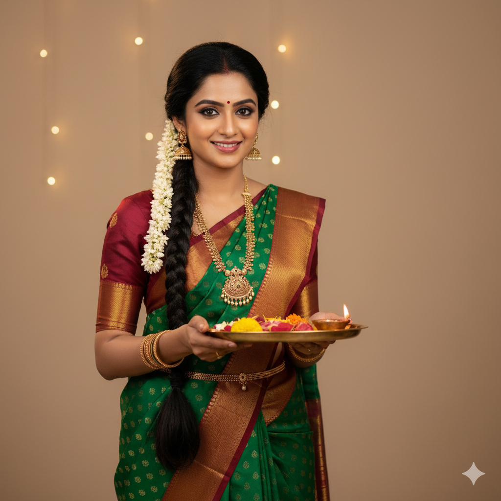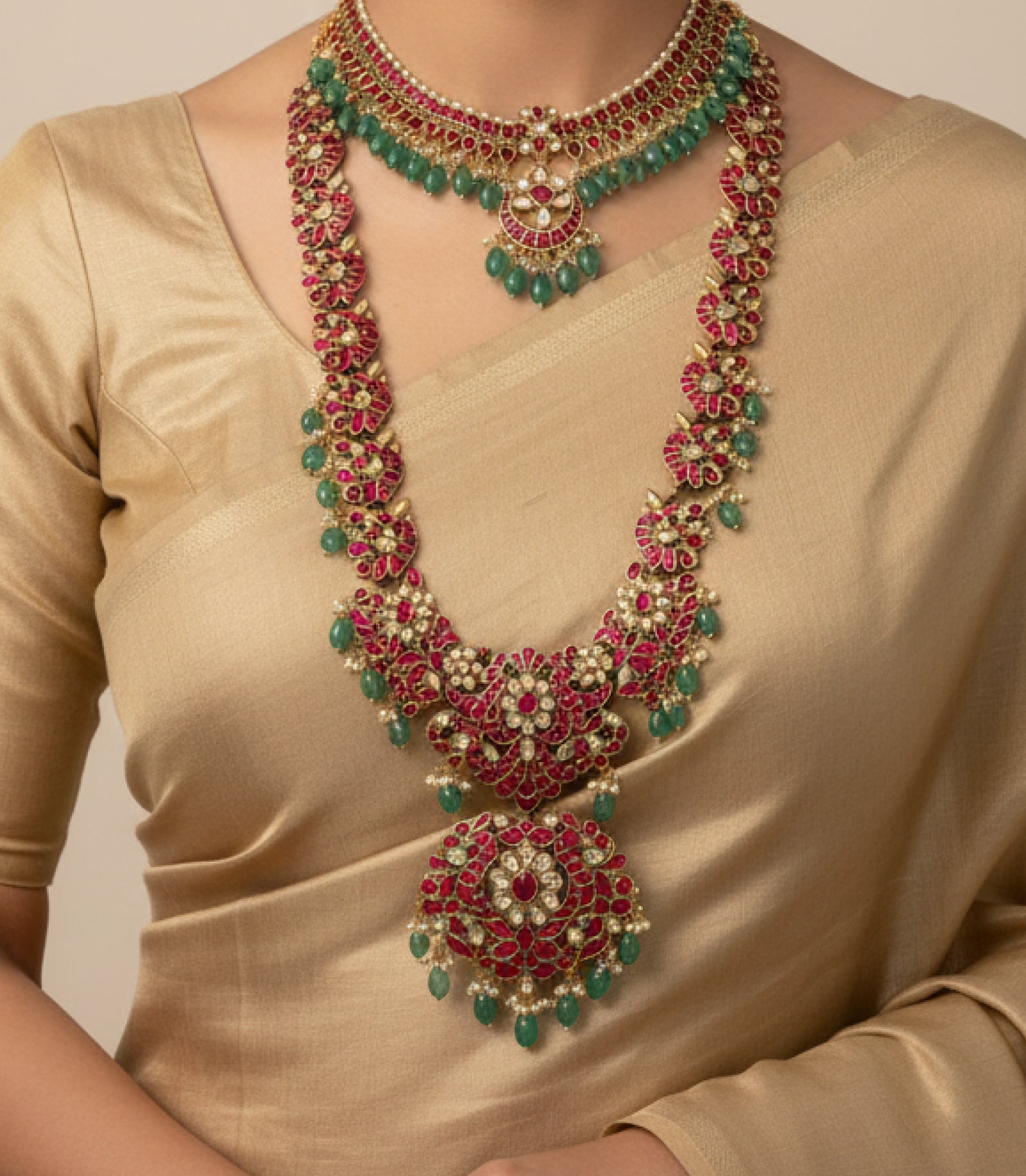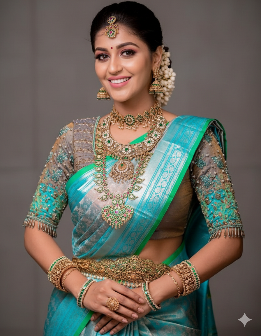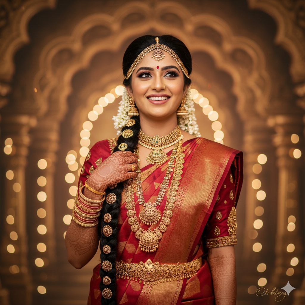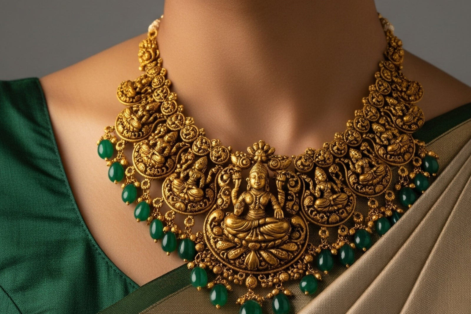 • Muhurtham Jewellery – Traditional Lakshmi Devi harams, vaddanam waist belts, vanki armlets, kasu mala, and temple chokers.
